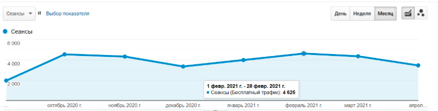 Traffic fluctuations ranged from 1950 visitors in September 2020 to (minimum value) to 4625 visitors in February (maximum value). It is worth noting that this particular niche is characterized by seasonality.