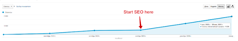 Старт робіт був у листопаді, далі за графіком відвідувачів можна спостерігати динаміку розвитку трафіку.