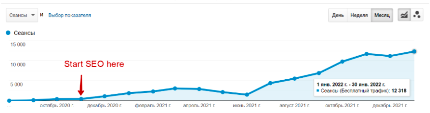 Таким чином, ми збільшили кількість відвідувань сайту з 400 відвідувачів у середньому значенні до робіт із SEO до 12318 у максимальному значенні після робіт (весь період робіт 15 місяців).