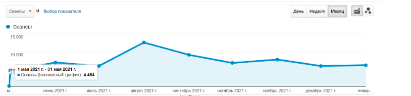З графіка видно, що вже у травні відбулася позитивна динаміка трафіку у кількості 4464 відвідувачів. Далі, в сезон досягла піку відвідувань у серпні 12 500 відвідувачів, чого не було за всю історію проекту до наших робіт. Далі незважаючи на спад піку відвідувань у сезон – трафік не падав нижче 5800 відвідувань на місяць.