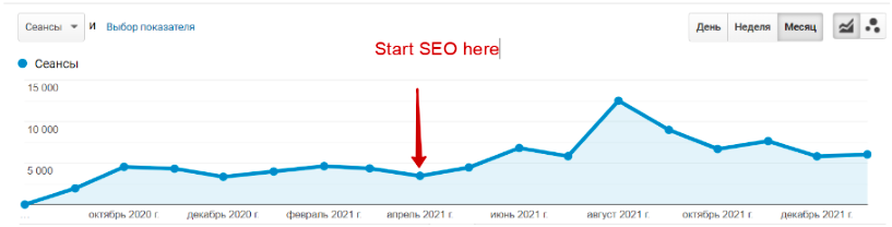 Таким чином, ми збільшили кількість відвідувань сайту з 4625 у максимальному значенні до робіт з SEO до 12508 у максимальному значенні після робіт, а також у стабілізації середнього показника відвідувань у несезонний час +30%.